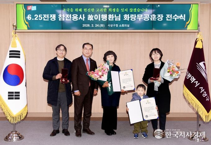 한국시사경제 김숙영 기자 | 부산 사상구는 지난 24일 구청 소회의실에서 6‧25전쟁 참전용사 故 이행환 병장의 유가족에게 화랑무공훈장을 전수했다.
