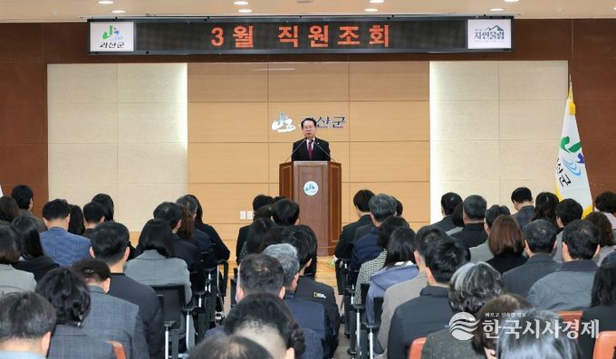 한국시사경제 충북취재본부 | 충북 괴산군은 3일 군청 대회의실에서 3월 직원조회를 열고 민생안정지원금 신청률 98.4% 달성에 따른 직원들의 노고를 격려하고 봄철 주요 현안업무에 전 행정력을 집중해 줄 것을 당부했다.
