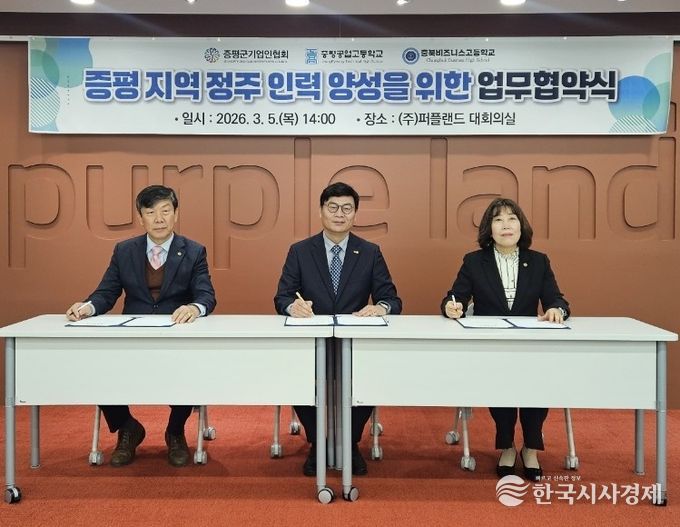협회는 5일 퍼플랜드 회의실에서 증평공업고등학교, 충북비즈니스고등학교와 ‘지역 정주 미래 기술 인력 양성을 위한 업무협약(MOU)’을 체결했다.