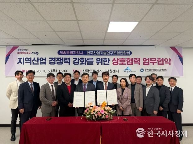 한국시사경제 세종취재분부 | 세종특별자치시가 5일 산학연클러스터지원센터에서 ㈔한국산업기술연구조합연합회(회장 김진우)와 지역산업 경쟁력 강화와 상호 협력을 위한 업무협약을 체결했다.