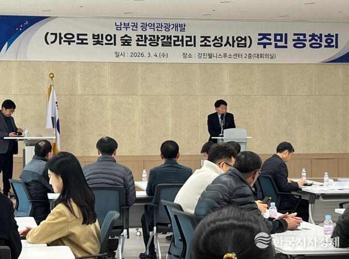 한국시사경제 권충현 기자 | 강진군이 지난 4일 강진웰니스푸소센터에서 군민 100여 명이 참석한 가운데 남부권 광역관광개발사업 ‘가우도 빛의 숲 관광갤러리 조성’ 주민공청회를 개최하고 사업 추진 방향을 공유했다.