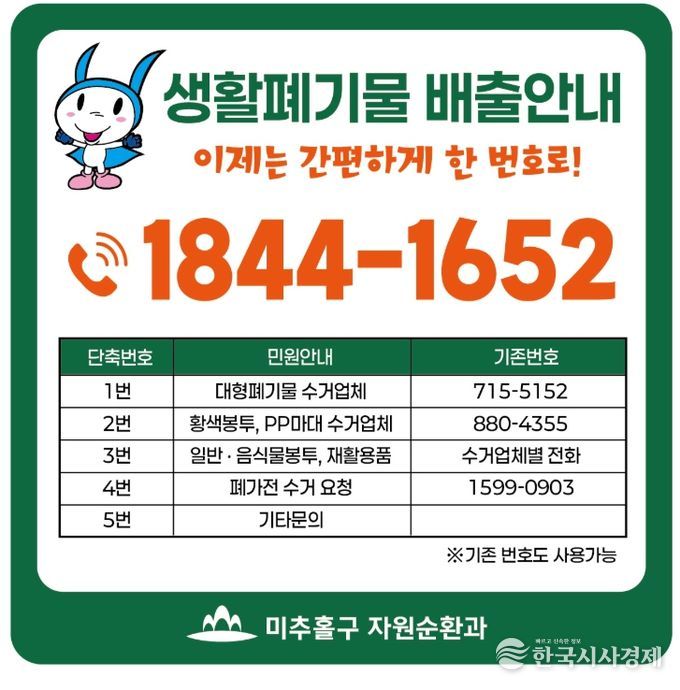 한국시사경제 사회팀 | 인천 미추홀구가 주민들의 생활폐기물 배출 편의를 획기적으로 개선하기 위해 ‘생활폐기물 대표번호 자동응답 서비스(1844-1652)’를 3월부터 본격 시행한다고 밝혔다.