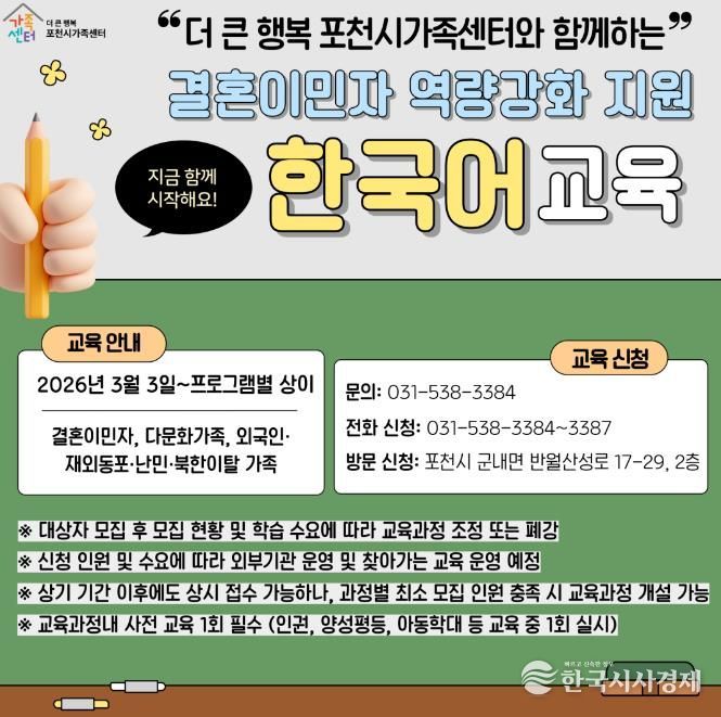한국시사경제 경기북부취재본부 | 포천시 더 큰 행복 포천시가족센터는 2026년 결혼이민자 역량강화 지원 사업의 일환으로 한국어교육 과정을 수준별, 단계별 체계로 확대 개편하고 본격적인 운영에 들어갔다.
