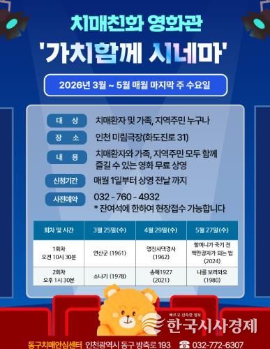 한국시사경제 윤광희 기자 | 인천 동구는 치매환자와 가족, 지역주민이 문화를 향유 할 수 있는 치매친화 영화관 ‘가치함께 시네마’를 오는 3월~5월까지 매월 마지막 주 수요일 운영한다고 밝혔다.