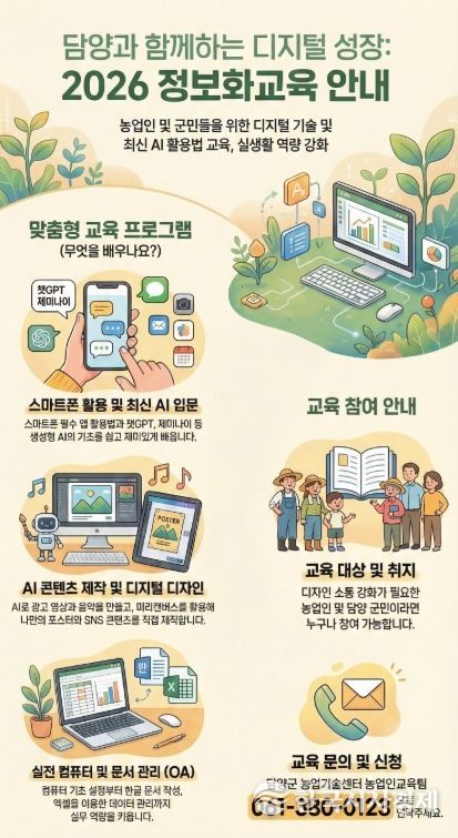 한국시사경제 경제팀 | 담양군은 지역 농업인의 디지털 소통 능력을 키우고 스마트한 농촌 환경을 조성하기 위해 ‘2026년 농업인 정보화 교육’을 추진한다.