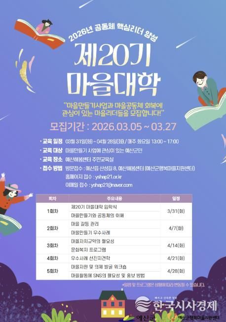 한국시사경제 충남취재본부 | 예산군행복마을지원센터는 주민이 주도하는 마을만들기 사업을 이끌 핵심 인재를 양성하기 위해 ‘제20기 마을대학’ 수강생을 3월 27일까지 모집한다고 밝혔다.