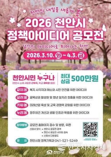 한국시사경제 충남취재본부 | 천안시가 시민의 창의적인 아이디어를 시정에 반영하고 정책 참여 문화를 확산하기 위해 ‘2026 천안시 정책 아이디어 공모전’을 개최한다.