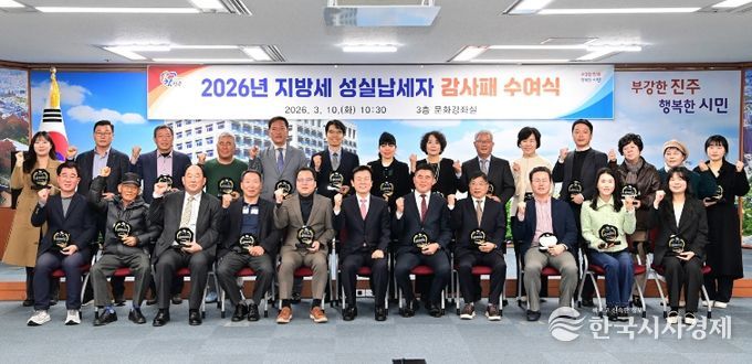 한국시사경제 윤광희 기자 | 진주시는 10일 시청 문화강좌실에서 지방세 납부에 대한 시민의식을 높이고 건전한 납세문화 조성을 위한 ‘2026 지방세 성실납세자 감사패 수여식’을 개최했다.