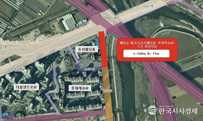 사업 계획 구간은 배방읍 세교리 호서웨딩홀에서 롯데캐슬아파트까지 연장 120m 구간으로, 기존 왕복 2차로를 3차로로 확장할 계획이다.