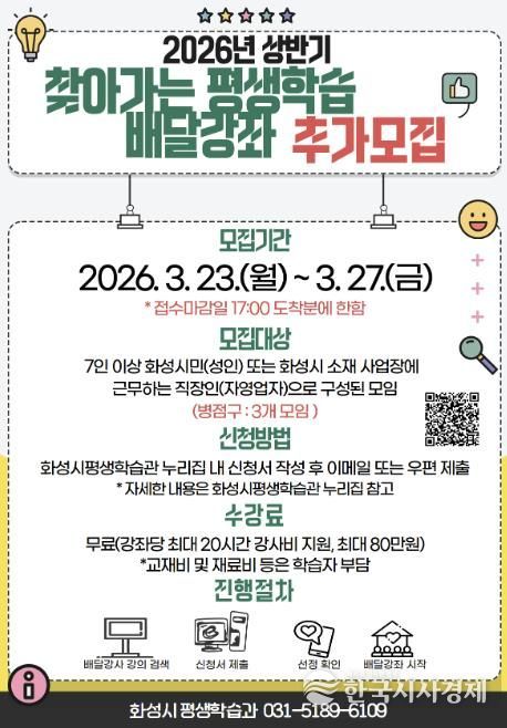 한국시사경제 사회팀 | 화성특례시는 시민의 다양한 학습 수요를 반영한 맞춤형 평생학습 프로그램 운영을 위해 ‘2026년 상반기 찾아가는 평생학습 배달강좌’를 추가 모집한다고 밝혔다.