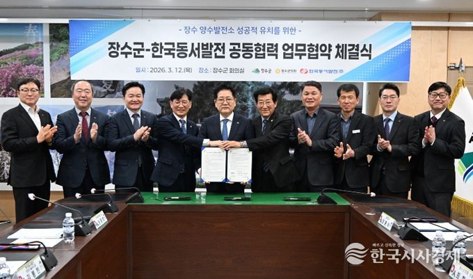 한국시사경제 권충언 기자 | 장수군은 12일 군청 회의실에서 장수군의회, 한국동서발전(주)과 장수군 양수 발전 사업 성공적 유치를 위한 공동협력 업무협약을 체결했다.