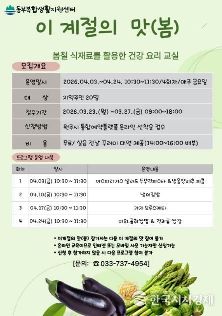한국시사경제 권충언 기자 | 원주시 동부복합생활지원센터는 오는 23일부터 ‘이 계절의 맛 (봄)’ 건강 요리 교실 프로그램 참여자를 모집한다.