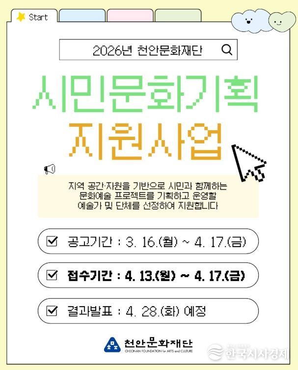 한국시사경제 충남취재본부 | 천안문화재단은 내달 13~ 17일 ‘시민문화기획 지원사업’ 참여 예술가를 모집한다고 16일 밝혔다.