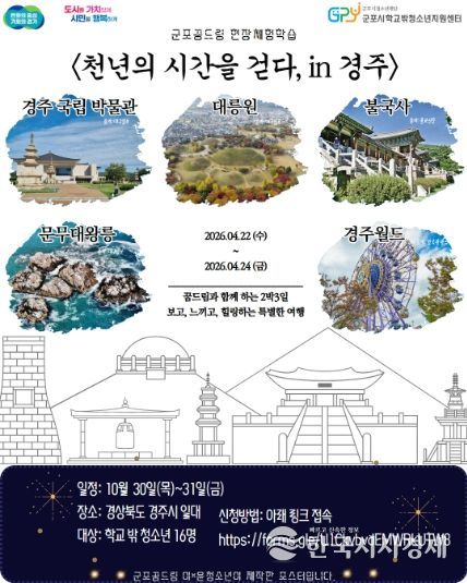 한국시사경제 사회팀 | (재)군포시청소년재단(대표이사 김덕희) 군포시학교밖청소년지원센터(센터장 강연미)는 학교 밖 청소년 16명을 대상으로 오는 4월 22일부터 24일까지 2박 3일간 경상북도 경주시 일대에서 ‘역사캠프 현장체험학습 프로그램’을 운영한다고 밝혔다. 참가신청은 구글폼 등을 통해 접수 받은 뒤 신청 내용을 바탕으로 참여 대상자를 선정할 예정이다.