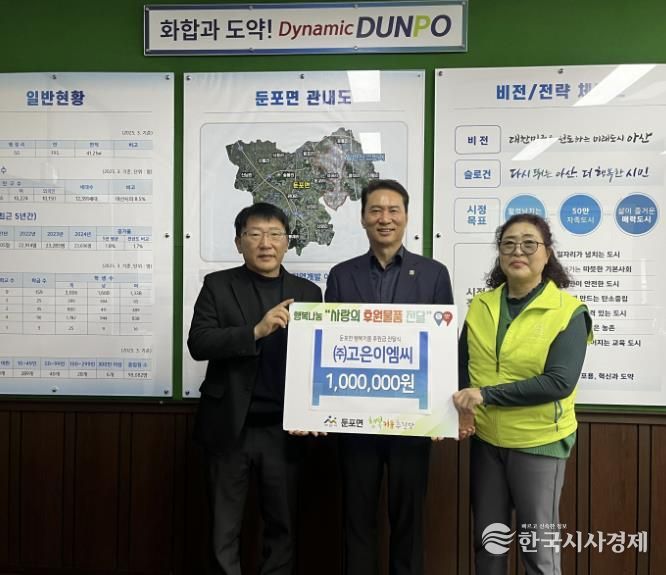 한국시사경제 충남취재본부 | ㈜고은이엠씨는 지난 17일 아산시 둔포면 행복키움추진단을 찾아 어려운 이웃을 위한 후원금 100만 원을 전달했다.