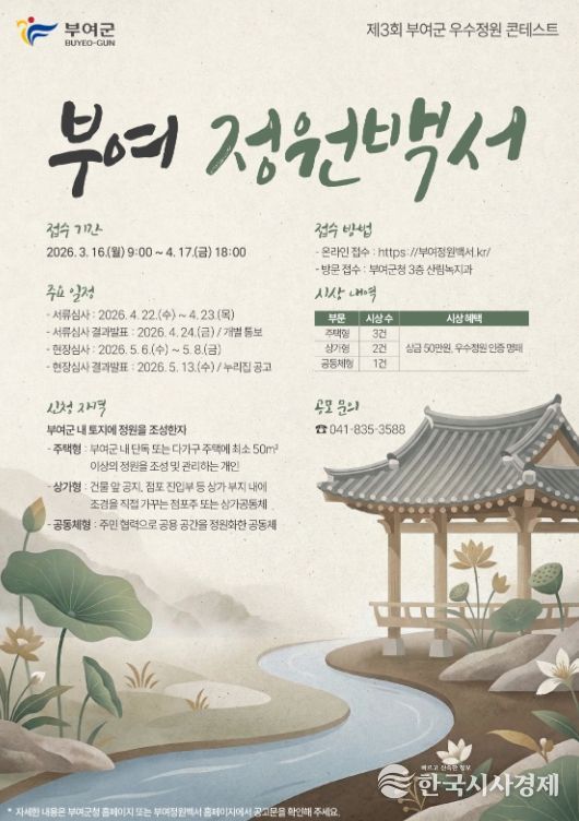 한국시사경제 김태훈 기자 | 부여군은 관내 정원문화 확산과 신규 관광자원 개발을 위해 ‘2026년 제3회 부여군 우수정원 콘테스트 - 부여 정원백서(庭園白書)’를 개최한다고 밝혔다.