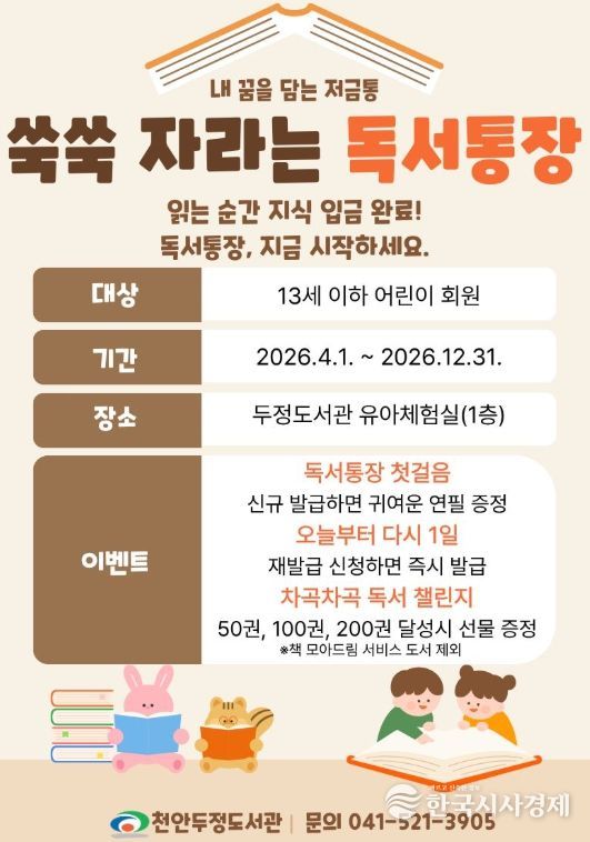 한국시사경제 충남취재본부 | 천안시 두정도서관은 내달부터 어린이들의 독서습관 형성을 위한‘쑥쑥 자라는 독서통장’프로그램을 운영한다고 18일 밝혔다.
