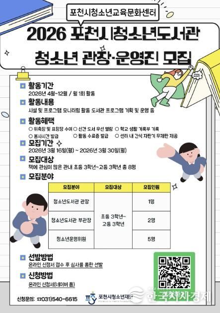 한국시사경제 경기북부취재본부 | 포천시청소년재단 포천시청소년교육문화센터는 청소년 참여형 도서관 운영을 위해 ‘2026년 포천시청소년도서관 청소년 관장 및 운영진’을 모집한다.