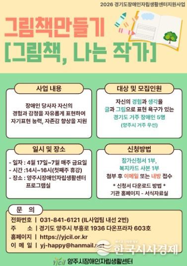 한국시사경제 문화팀 | 양주시장애인자립생활센터에서는 장애인의 문화·예술 참여 기회를 확대하고 자기 표현의 장을 마련하기 위해 그림책 만들기[그림책, 나는 작가] 참가자를 모집한다.