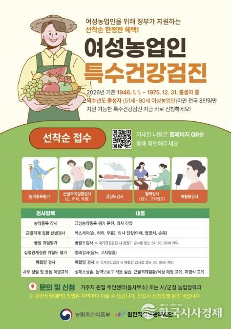 군은 오는 4월 10일까지 관내 거주하는 만 51~80세(1946년 1월 1일~1975년 12월 31일) 사이의 짝수 연도 출생 여성농업인 530여 명을 대상으로 건강검진 지원 신청을 주소지 읍·면 행정복지센터를 통해 접수하고 있다.