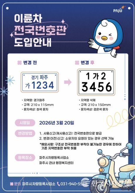 한국시사경제 경기북부취재본부 | 파주시는 오는 20일부터 이륜차 전국번호판 제도를 본격 시행한다.