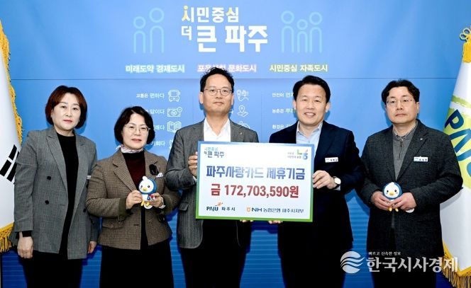 이날 전달된 제휴카드 기금은 파주시와 엔에이치(NH)농협은행 파주시지부가 업무협약을 맺고 파주사랑카드, 보조금카드 이용액의 0.2~1%를 기금으로 적립해 조성한 금액이다. 전달된 기금은 파주시의 지역개발사업, 복지사업, 후원사업 등 지역 발전에 사용될 예정이다.