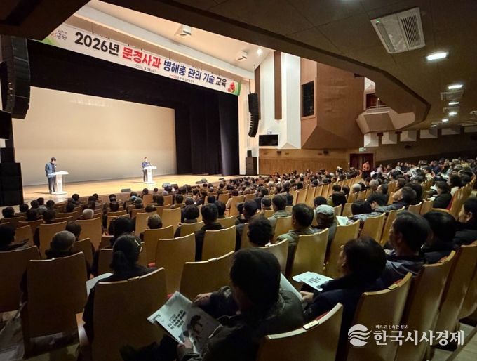 한국시사경제 경북취재본부 | 문경시농업기술센터는 3월 18일 문화예술회관 대공연장에서 2026년 문경사과 병해충 관리 기술 교육을 추진했다.