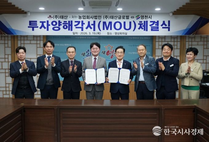 한국시사경제 경북취재본부 | 영천시는 19일 시청 영상회의실에서 ㈜태산과 농업회사법인 ㈜태산글로벌과 220억원 규모의 투자협약(MOU)을 체결했다.