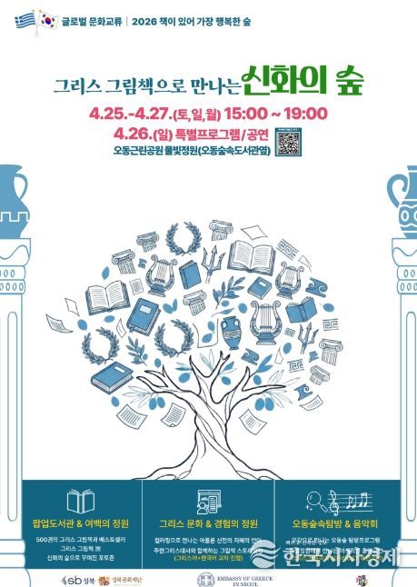 행사장 전역에는 ▲500여 권의 도서를 갖춘 ‘팝업도서관’ ▲숲속에서 감상하는 ‘그리스 그림책展’ ▲신화 속 장면을 재현한 ‘포토존’이 운영된다. 특히 고대 그리스 아폴론 신전의 델픽 격언을 배우는 ‘지혜의 언어 컬러링’과 ‘그리스 알파벳 스탬프 체험’은 어린이들이 고대 그리스 문화를 친숙하게 접할 수 있는 기회를 제공할 예정이다.