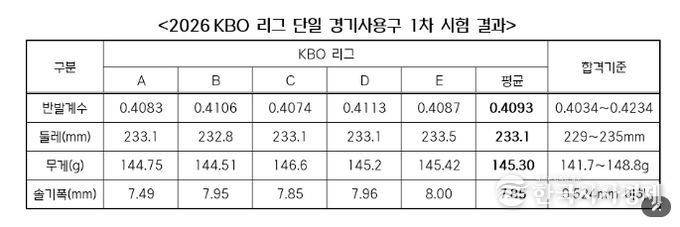 한국시사경제 스포츠팀 | KBO는 3월 30일(월) 2026 신한 SOL KBO 리그 단일 경기사용구의 1차 수시검사 결과를 발표했다.