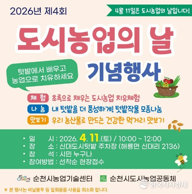 한국시사경제 전남취재본부 | 순천시는 오는 4월 11일 오전 10시 신대도시텃밭에서 ‘2026년 제4회 도시농업의 날 기념행사’를 개최한다고 밝혔다.
