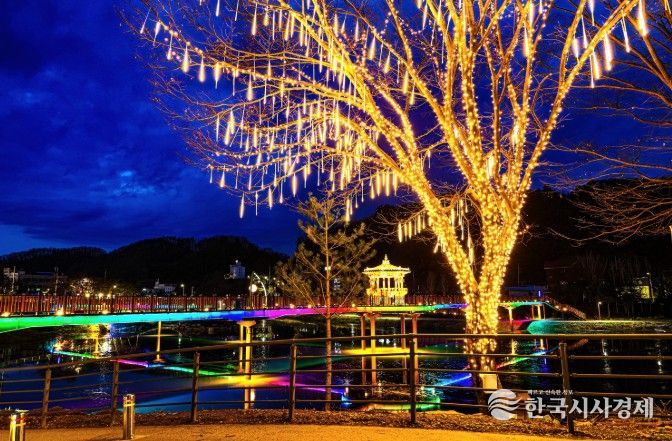 한국시사경제 충북취재본부 | 괴산군 오작교 일원이 야간 경관조명으로 새로운 볼거리를 선사하고 있다.