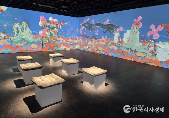 이번 '재히어니, 몽환의 틈'은 주재현 작가가 1982년부터 1984년 사이 집중적으로 제작한 작품을 중심으로 구성됐으며, 기이한 생명체와 물고기, 인물 형상 등 독창적인 이미지들을 통해 작가의 상상 세계를 입체적으로 드러낸다. 특히 작품을 단순히 감상하는 방식에서 벗어나, 이미지들이 생성되던 감각과 흐름을 체험할 수 있도록 기획된 점이 특징이다. 전시장 내에는 가로, 세로 약 12m 규모의 몰입형 미디어아트 공간이 조성되어, 작품 이미지들이 떠다니고 흐르는 장면을 통해 관람객이 마치 주재현 작가의 머릿속을 직접 거니는 듯한 경험을 제공한다.