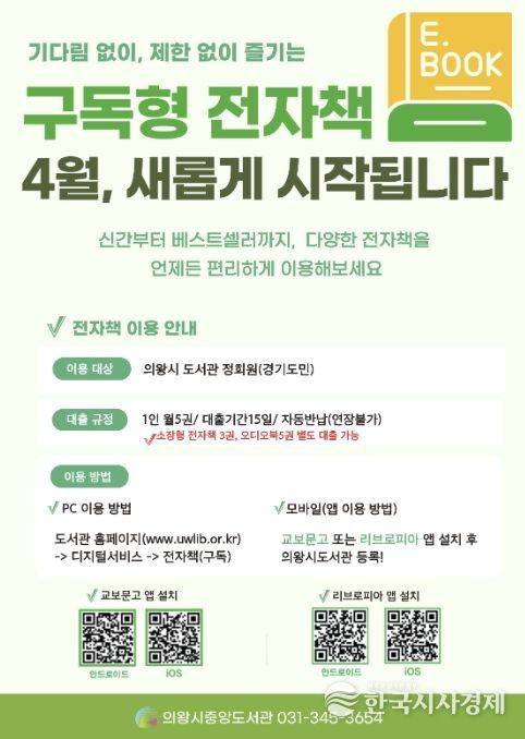 한국시사경제 권충현 기자 | 의왕시가 4월부터 시민의 정보 접근성을 높이고 디지털 독서문화 확산을 위해 ‘구독형 전자책 서비스’와 ‘온라인 학술 데이터베이스(DBpia) 서비스’를 도입한다.