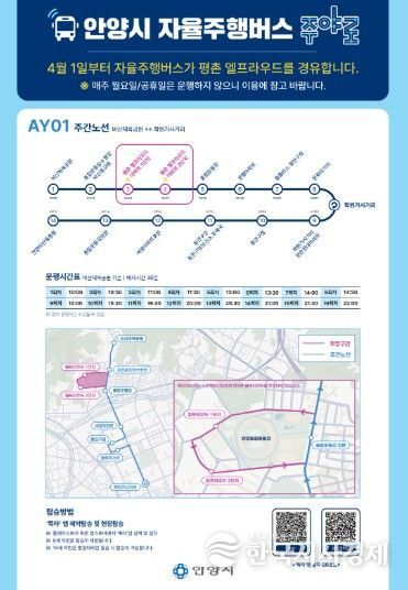 운행 노선도 일부 연장됐다. ‘주야로’는 평촌엘프라우드 아파트를 새롭게 경유해 1단지와 2단지에 각각 정차한다. 상행선(비산체육공원→학원가사거리 방면)은 종합운동장수영장.비산동교회 정류장을 거쳐 평촌엘프라우드 아파트 1, 2단지에 각각 추가 정차한다. 반면 하행선(학원가사거리→비산동 종점)은 기존과 동일하게 해당 아파트를 경유하지 않는다.