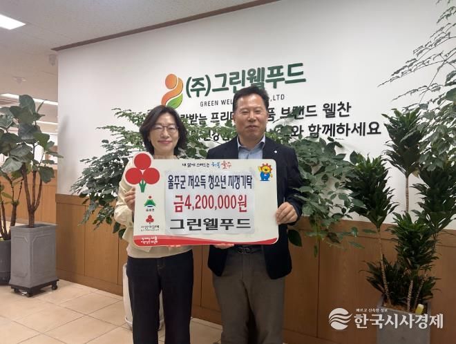 한국시사경제 울산취재본부 | 울주군 웅촌면에 소재한 ㈜그린웰푸드가 2일 울주군 내 저소득 청소년 가정을 위한 후원금 420만원을 지정기탁했다.
