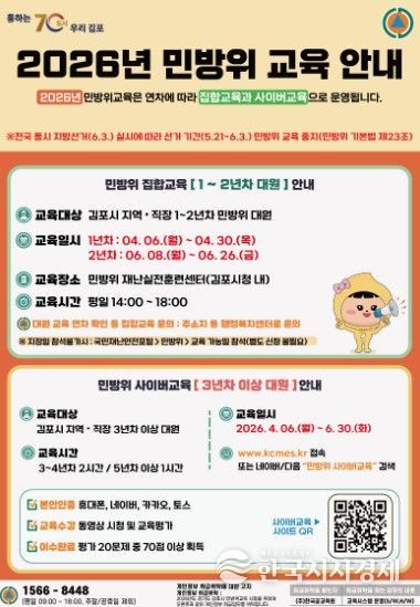 한국시사경제 경기북부취재본부 | 김포시는 2026년 상반기 민방위 대원의 안보 의식 고취와 재난 대응 역량 강화를 위해 ‘2026년 상반기 민방위 교육’을 본격적으로 시행한다고 밝혔다. 이번 교육은 민방위 대원의 연차에 따라 집합교육과 사이버교육으로 구분되어 진행되며, 특히 올해는 연차별 일정을 세분화해 운영한다.