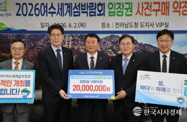 한국시사경제 전남취재본부 | (재)2026여수세계섬박람회조직위원회는 4월 2일 전남도청 VIP실에서 탑솔라㈜와 ‘2026여수세계섬박람회 입장권 구매약정식’을 개최했다고 밝혔다.