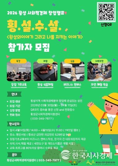 횡성군 사회적경제 지원 센터는 지역 내 사회적경제 활성화와 창업 생태계 조성을 위한 ‘2026 횡성 사회적경제 창업 캠프 '횡.설.수.설.'’ 참가자를 모집 중이라고 4일 밝혔다.