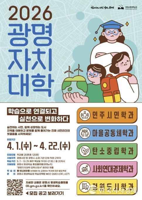 한국시사경제 경기취재본부 | 광명시가 시의 핵심의제인 평생학습 마을리더 양성과정 ‘광명자치대학’ 2026년 신입생 125명을 오는 22일까지 모집한다.