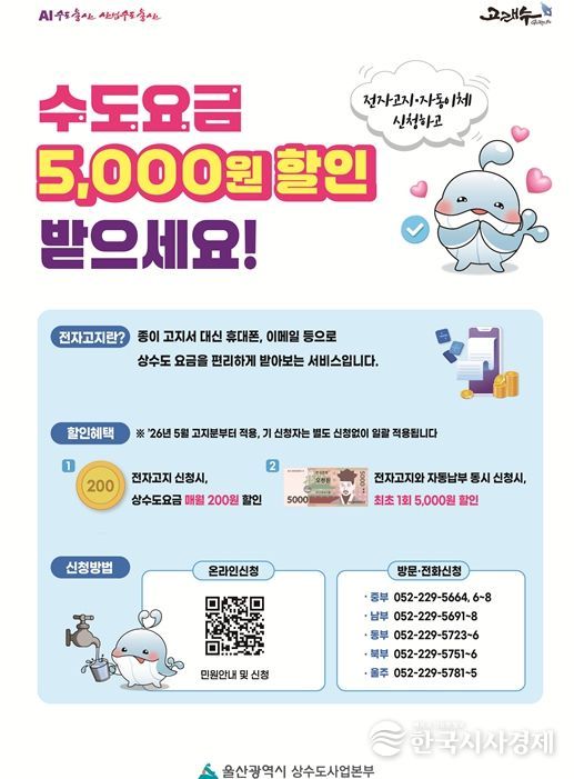 한국시사경제 울산취재본부 | 울산시 상수도사업본부는 시민들의 요금 납부 편의 증진과 종이고지서 사용 감축을 통한 친환경 행정 실현을 위해 오는 5월부터 상수도요금 전자고지 및 자동납부 신청자에게 요금 할인 혜택을 제공한다고 밝혔다.