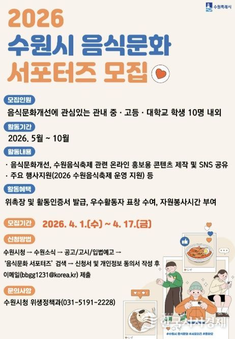 한국시사경제 사회팀 | 수원특례시는 ‘2026년 음식문화 서포터즈’로 활동할 중·고등·대학생을 4월 17일까지 모집한다.