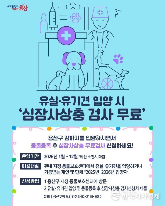 지원 대상은 2025~2026년 중 용산구 관내 지정 동물보호센터에서 유실·유기견을 입양하거나 기증받는 개인 및 단체다. 동물보호센터에 검사신청서를 제출하면 심장사상충 검사를 1회 무료로 받을 수 있다. 구가 검사비 전액을 부담하며, 사업은 예산 소진 시까지 진행된다.