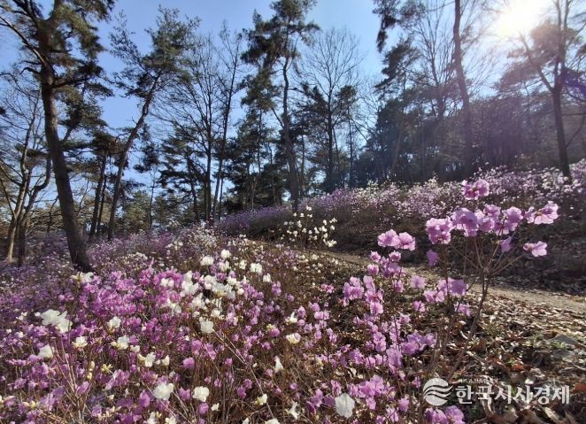 한국시사경제 충남취재본부 | 청양군 청양읍의 중심에 위치한 우산 산림조경숲 산책로가 분홍 진달래와 희귀한 백진달래의 환상적인 조화로 등산객들의 마음을 사로잡고 있다.