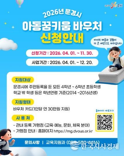 이번 사업은 문경시에 주민등록을 둔 초등학교 4학년부터 6학년까지 아동을 대상으로 하며, 약 1,200명이 혜택을 받을 예정이다. 1인당 연간 30만 원이 지원되는 맞춤형 복지 정책으로, 바우처는 전용 카드 형태로 지급되며 2026년 4월부터 12월 20일까지 사용할 수 있다.