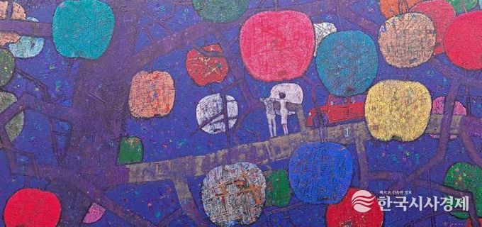 화면 속 채색은 사과의 외형을 재현하기보다 그 안에 응축된 기운을 드러내며, 존재의 본질에 대한 사유를 회화적 장으로 펼쳐낸다.