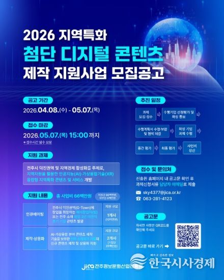 한국시사경제 윤경수 기자 | 전주정보문화산업진흥원은 인공지능(AI)과 가상융합기술(XR)을 전주 고유의 문화·역사 자산과 결합하는 ‘지역특화 첨단 디지털 콘텐츠 제작 지원 사업’에 참여할 기업을 모집한다고 13일 밝혔다.