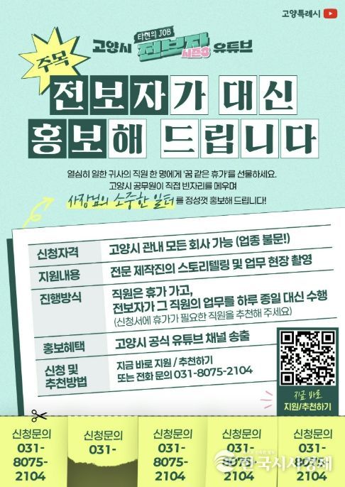 한국시사경제 권충현 기자 | 고양특례시가 공식 유튜브 채널의 직업 체험 콘텐츠 ‘전보자(타인의 Job)’ 시즌 3를 맞아, 시민 삶의 현장으로 직접 찾아가는 홍보 프로젝트에 참여할 기업과 일터를 모집한다고 14일 밝혔다.