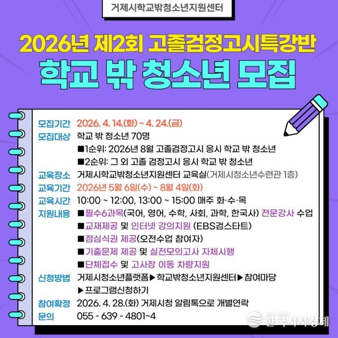 한국시사경제 문화팀 | 거제시학교밖청소년지원센터에서는 2026년도 제2회 고등학교 졸업학력 검정고시 대비 검정고시특강반에 참석할 학교 밖 청소년을 모집한다.