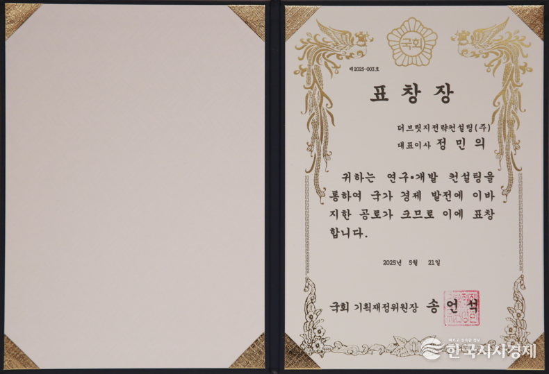 한국시사경제 김태훈 기자 | 더브릿지전략컨설팅(주)정민의 대표가 한국시사경제, 코리아타임뉴스 주최(윤광희 회장)로 27일 서울 프레스센터에서 열린 ‘2025 대한민국 글로벌파워브랜드 대상(GPBA)’ 시상식에서 대상 수상의 영예를 안았다. 아울러 국회 기획재정위원장 표창도 함께 수상하며 공공정책 기획 분야에서의 전문성과 성과를 입증했다.